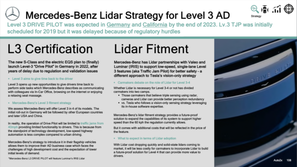 Level 3 and L4 require augmented sensing capabilities thus additional front sensors are expected to become part of the ADAS sensor set to enhance robustness. Lidar and/or high-definition radars are expected to become the norm for this, as Audi A8’s lidar above, but not everybody is going in this direction.